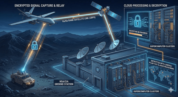 به زبان ساده: وقتی شما با تلفن ماهواره‌ای یا موبایل صحبت می‌کنید، صدای شما تبدیل به بسته‌های دیجیتالی شده و به سمت آسمان (دکل یا ماهواره) پرتاب می‌شود. پهپاد جاسوسی مثل یک پستچی فضول است که در مسیر نشسته است. او نامه‌های دیجیتالی (بسته‌های صدا) شما را که به سمت بالا می‌روند، کپی می‌کند. چون پهپاد خیلی بالاتر از کوه‌ها و ابرهاست، هیچ مانعی برای دریافت این نامه‌ها ندارد.