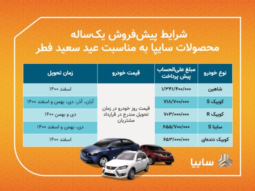 به گزارش خط بازار، گروه خودروسازی سایپا در راستای ایجاد شرایط یکسان و برابر برای همه متقاضیان خرید خودرو و فراهم سازی سازوکار شناسایی و عرضه خودرو به مصرف کنندگان واقعی خودرو از ۲۰ اردیبهشت ماه ساعت ۱۰ صبح پیش فروش یکساله ۵ خودروی شاهین، کوییکS، کوییکR، سایناS و کوییک دنده ای را به مناسبت عید سعید فطر آغاز می کند.