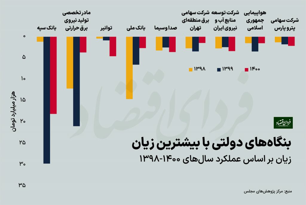 نمودار زیر زیان‌ده‌ترین شرکت‌ها را نشان می‌دهد. در میان این شرکت‌ها دو بانک دولتی قرار دارند. صداوسیما هم از جمله شرکت‌های دولتی است که در سال‌های گذشته زیان زیادی بر جای گذاشته است. زیان‌ده‌بودن شرکت‌های حوزه برق و آب هم از جمله عوامل کمبودهای انرژی فعلی می‌تواند باشد.