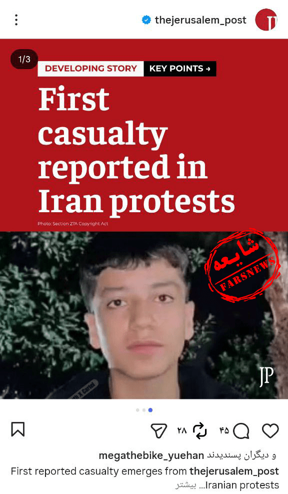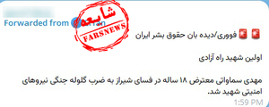 در یکی از این شایعات رسانههای ضدایرانی با انتشار تصویر زیر مدعی شدند: «مهدی سماواتی معترض ۱۸ ساله در فسای شیراز به ضرب گلوله جنگی نیروهای امنیتی شهید شد./ اولین شهید راه آزادی»