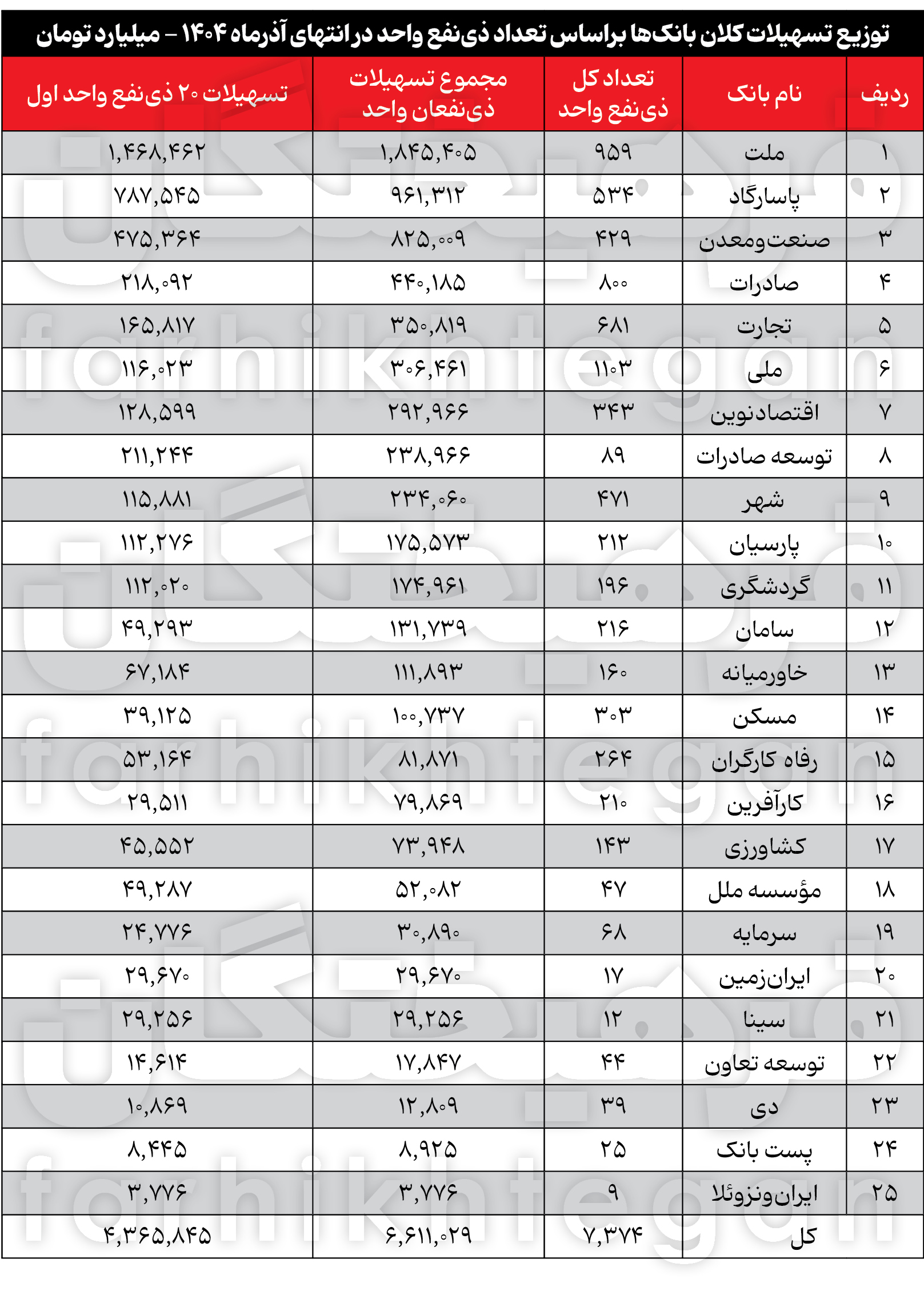 بر اساس اطلاعات استخراجی از دادههای بانک مرکزی، بانک ملت با ۹۵۹ ذینفع واحد و تسهیلات ۱۸۴۵ هزار میلیارد تومانی، در رتبه اول قرار دارد. سهم ۲۰ شخص اول در این بانک ۱۴۶۸ همت است. طبق دادههای بانک مرکزی، در این بانک، شرکت مهندسی وتوسعه گازایران زیرمجموعه وزارت نفت با رقم عجیبوغریب ۱۰۴۴ همتی، در رتبه اول قرار داشته و بخش عمده تسهیلات کلان ذینفعان واحد را به خود اختصاص داده است.