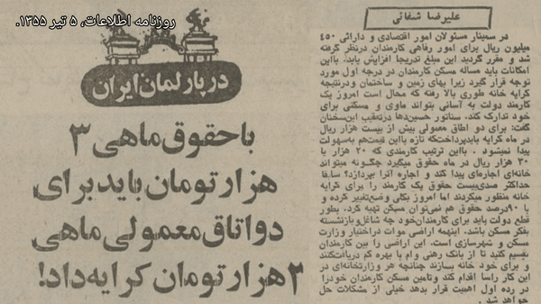 روزنامه اطلاعات در پنجم تیر ماه سال ۱۳۵۵، گزارشی را با عنوان «با حقوق ماهی ۳ هزار تومان باید برای دو اتاق معمولی ۳ هزار تومان کرایه داد» ارائه کرده که اوضاع مسکن در آن مقطع را نشان میدهد.این روزنامه نوشته است: «در سمینار مسئولان امور اقتصادی و دارایی، ۴۵۰ میلیون ریال برای امور رفاهی کارمندان در نظر گرفته شد و مقرر گردید این مبلغ تدریجاً افزایش یابد.
