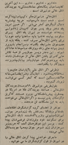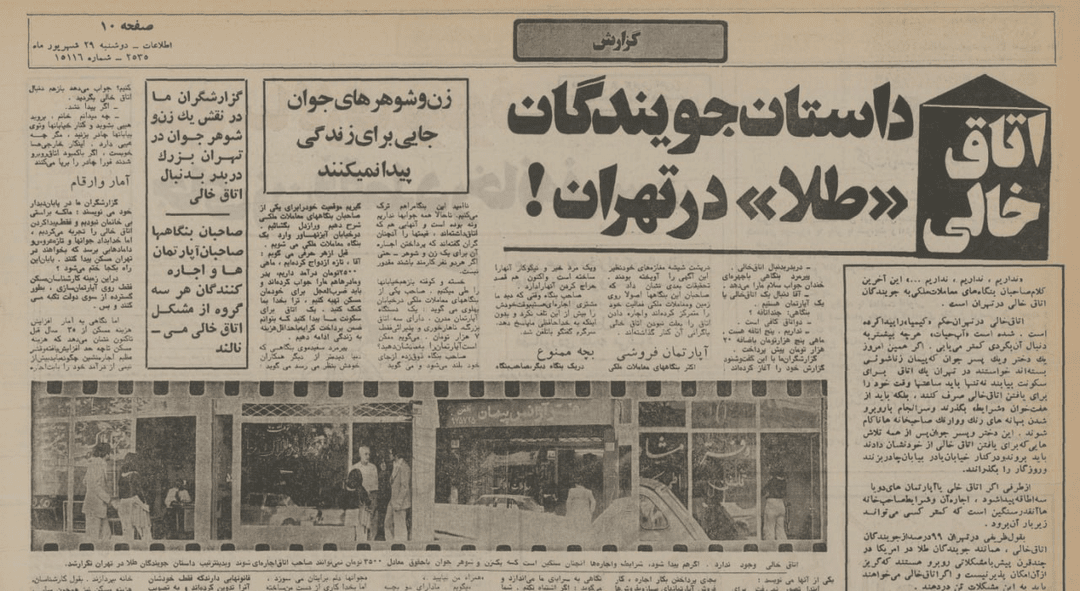 این روزنامه در تاریخ ۲۹ شهریور ۱۳۵۵ نیز به کمبود مسکن اشاره کرده و به این موضوع که «زوجهای جوان جایی برای زندگی پیدا نمیکنند» پرداخته است. در این روزنامه آمده است: «اتاق خالی در تهران حکم «کیمیا» را پیدا کرده است. شده است «آب حیات» هرچه بیشتر به دنبال آن بگردی کمتر مییابی. اگر همین امروز یک دختر و یک پسر جوان که پیمان زناشویی بستهاند، خواستند در تهران یک اتاق برای سکونت بیابند، نه تنها باید ساعتها وقت خود را برای یافتن اتاق خالی صرف کنند، بلکه باید از هفتخوان «شرایط» بگذرند و سرانجام با روبهرو شدن بهانههای رنگووارنگ صاحبخانهها ناکام شوند». (روزنامه اطلاعات، ۲۹ شهریور ۱۳۵۵، صفحه ۱۰.)