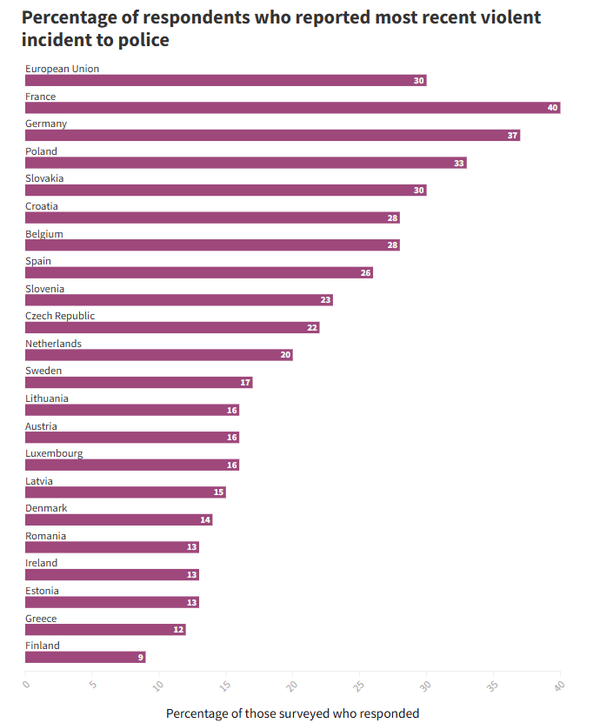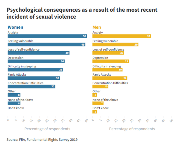 «جوآنا گودی»، رئیس واحد تحقیقات FRA میگوید که «بسیاری از زنان خشونت را گزارش نمیکنند، چون با فرد متجاوز زندگی میکنند یا نگران پیامدهای اجتماعی و خانوادگیاند.» نتایج همین نظرسنجی نشان میدهد زنان پس از تجربه خشونت بیشتر دچار: اضطراب، احساس آسیبپذیری، کاهش اعتمادبهنفس، حملات پانیک، افسردگی و اختلال خواب میشوند.