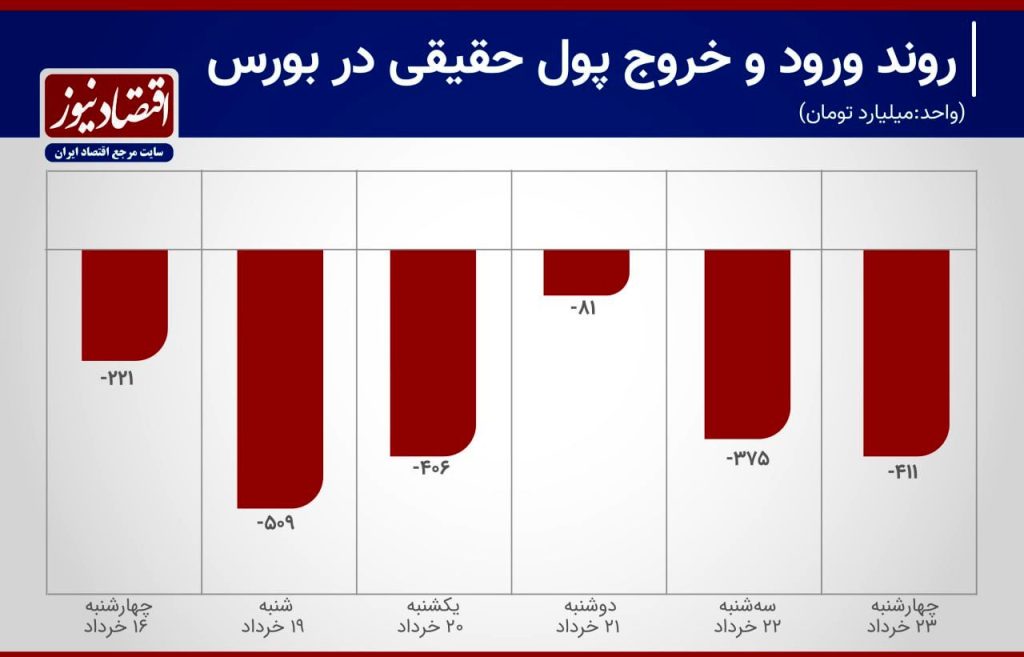 روز دوشنبه نیز ۸۱ میلیارد تومان پول حقیقی خارج شد. روز سهشنبه ۳۷۵ میلیارد تومان خارج شد. در آخرین روز معاملاتی هفته پول حقیقی خارج شد و ارزش تغییر مالکیت حقیقی به حقوقی بازار ۴۱۱ میلیارد تومان بود.